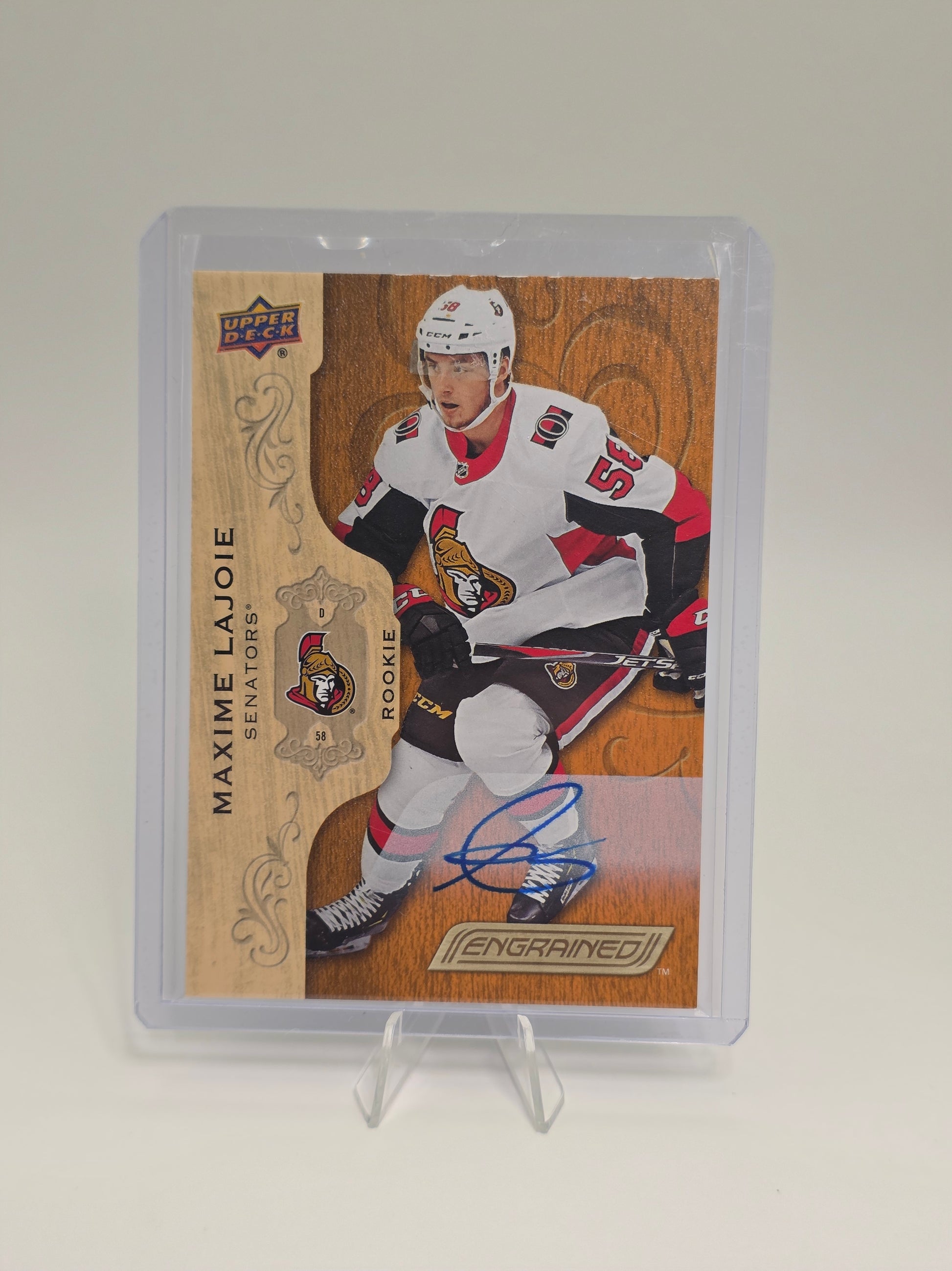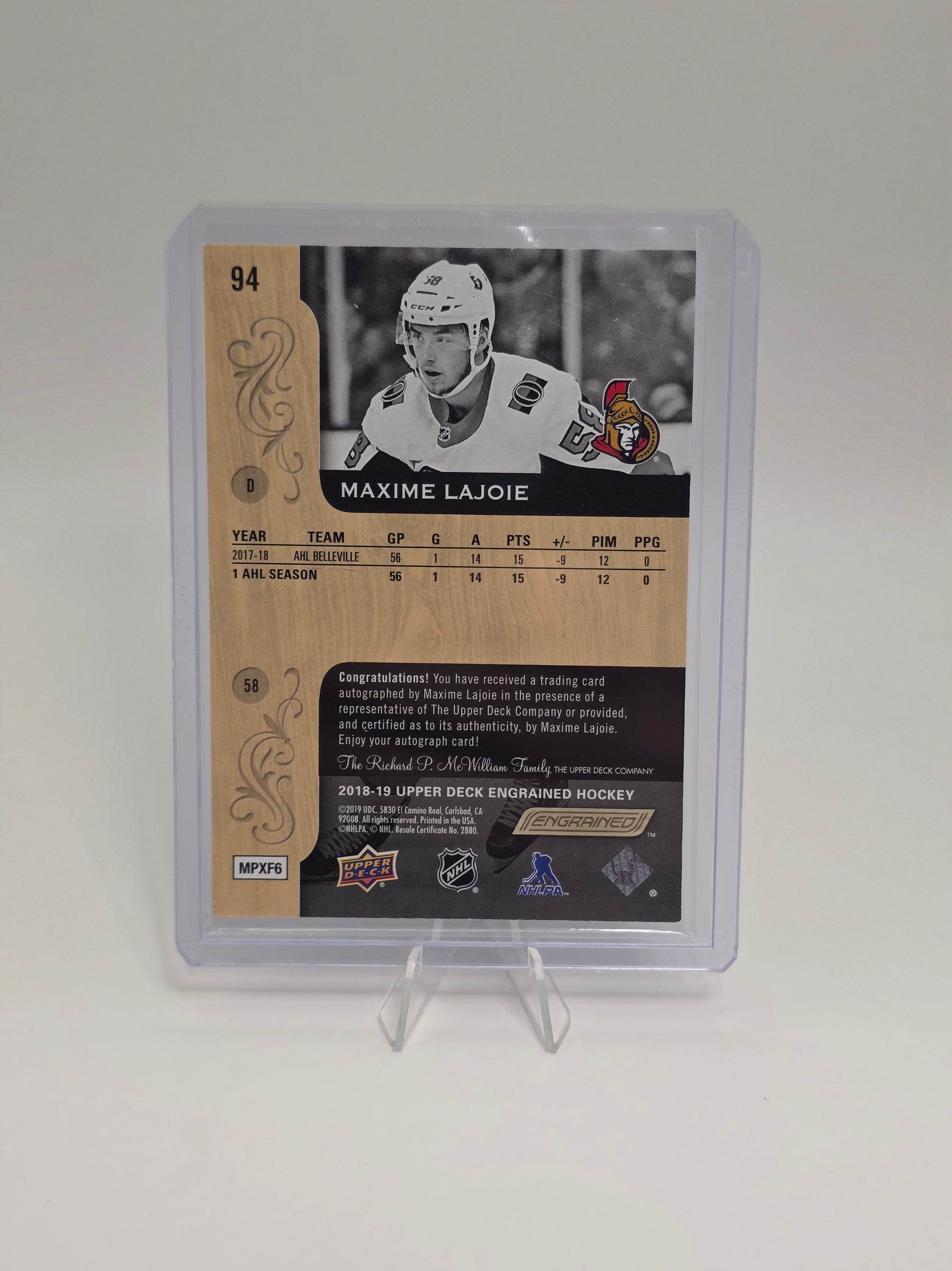 2018–19 Upper Deck — Engrained / Autograph Rookie — Maxime Lajoie (Card #94, MPXF6 / Autograph variants)