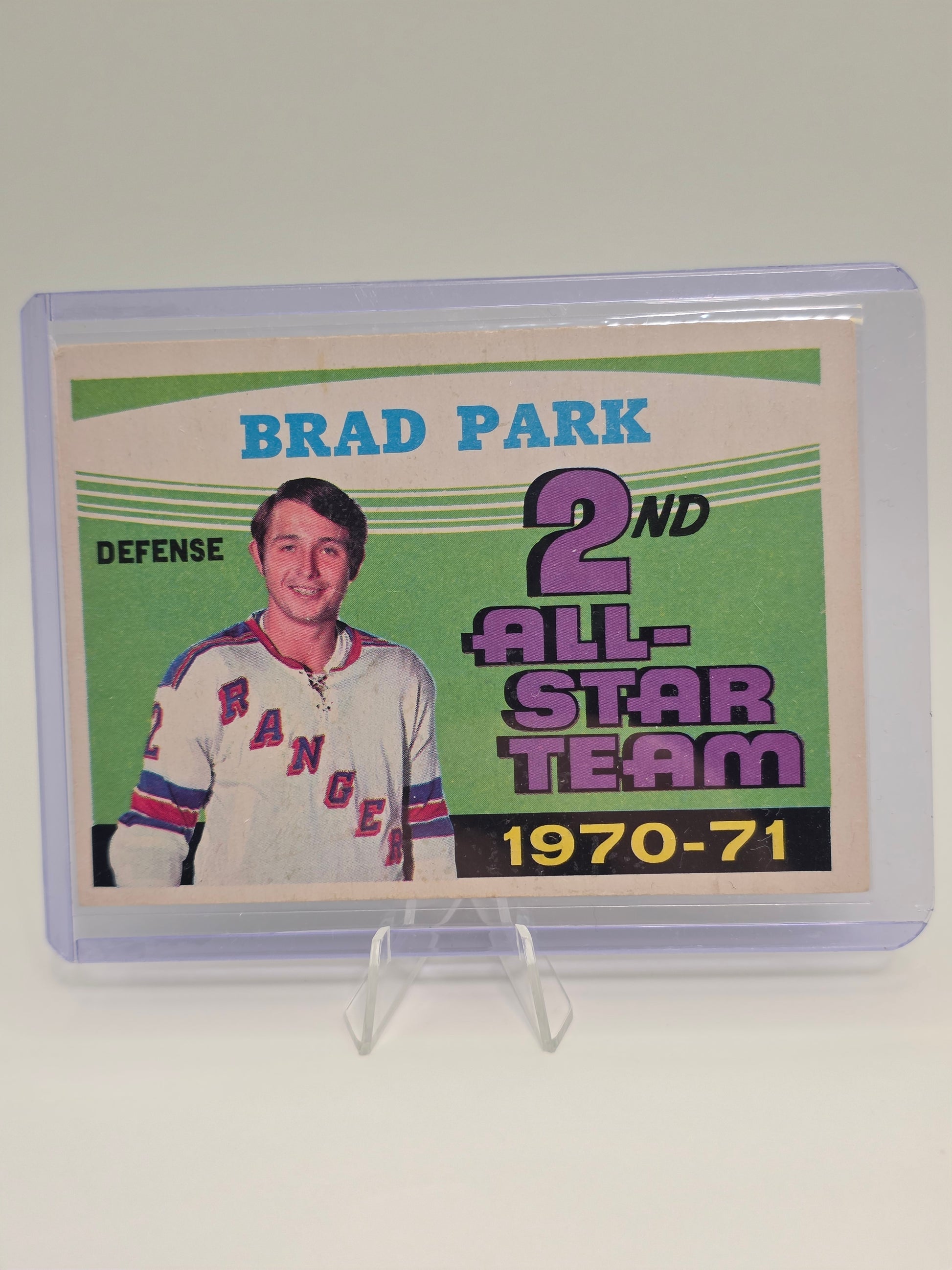 Vintage-era Brad Park card celebrating his 2nd All-Star Team selection — a tasteful addition for Hall-of-Fame era collections. Classic borders and era-authentic graphics give this card timeless shelf presence.